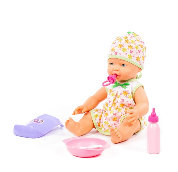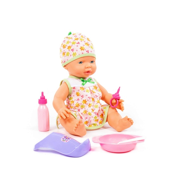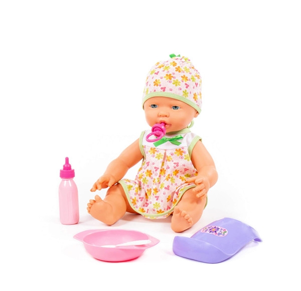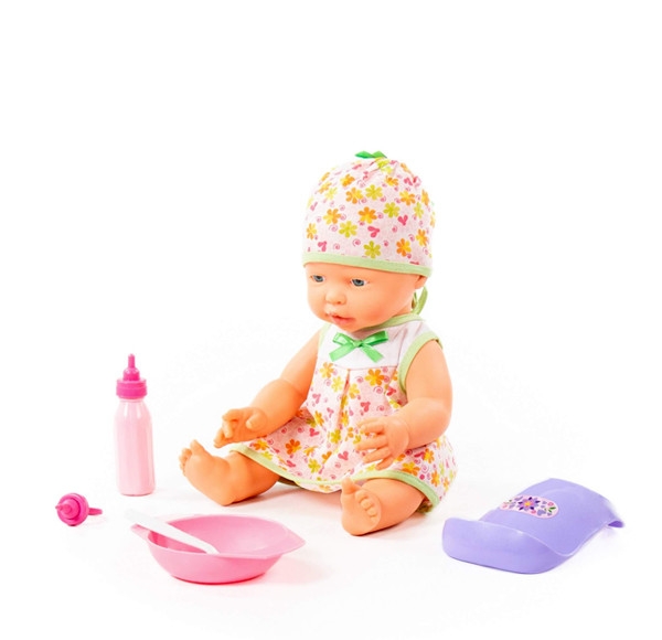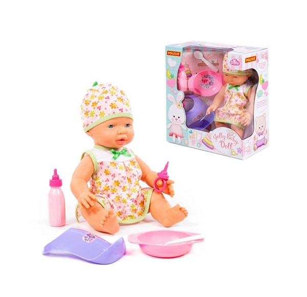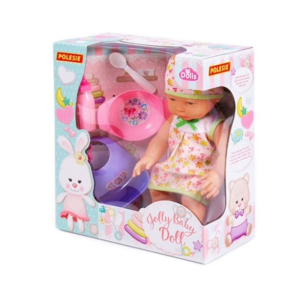 Bábika Jolly je 35cm veľká s pevným telom a hlbokými očkami, ktoré nežmurkajú, v balení so súpravou na kŕmenie: plastovým podbradníkom, tanierikom s priemerom 9 cm, lyžičkou 10 cm veľkou, fľaškou a cumlíkom. Výborná hračka pre malé mamičky vo veku od 3 rokov.
