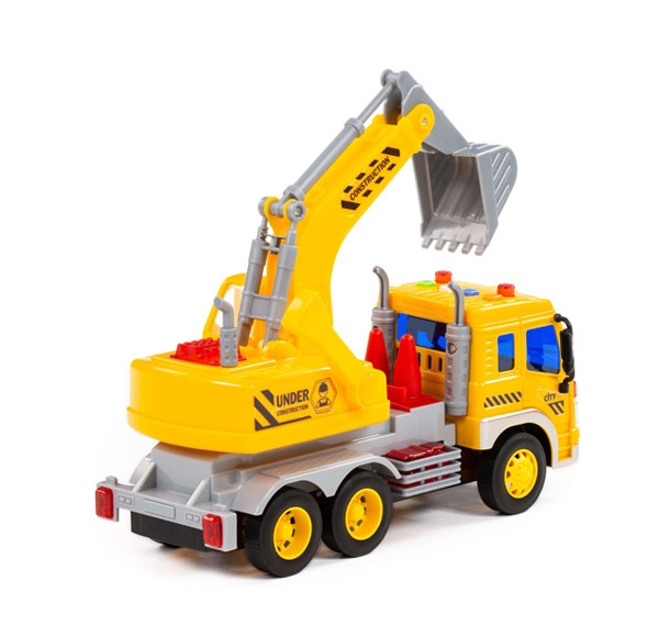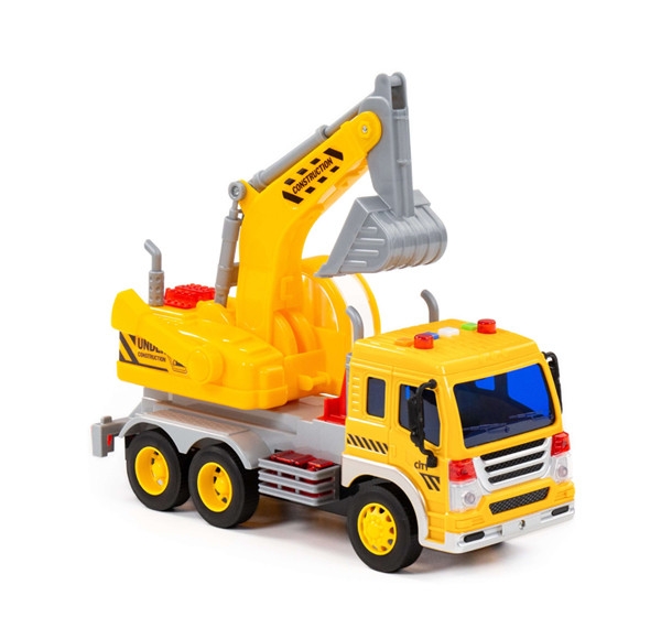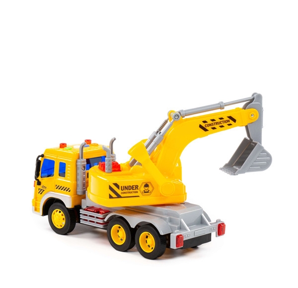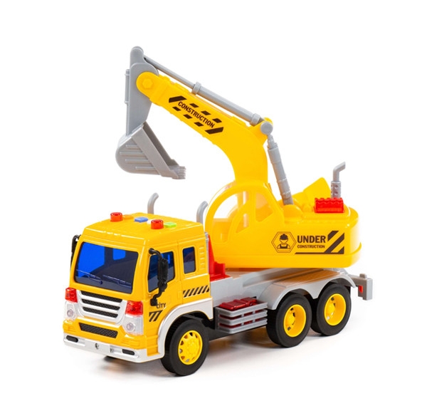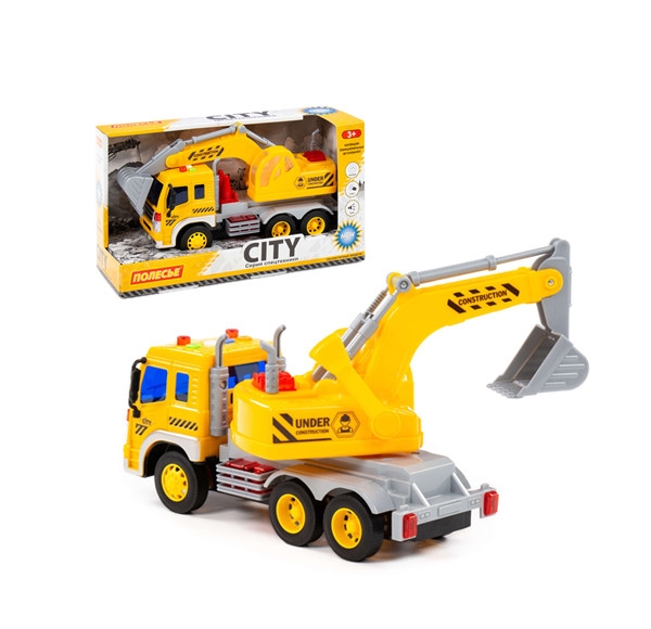 Auto City bager truck je 28 x 10 x 16 cm veľké s pohonom na zotrvačník. Strojovňa bagra je otočná o 360 stupňov, výložník bagra môžeme zdvíhať a spúšťať cez západkový mechanizmus a lopata bagra je ovládaná páčkou na boku strojovne. Na streche kabíny sú 4 tlačidlá, po ich stisnutí znie zvuk štartovania a chodu motora, trúbenie, zvuk hydrauliky pri činnosti a signál pri cúvaní. Súčasne striedavo svietia majáky. Batérie 3 x LR44 1,5V sú súčasťou hračky.